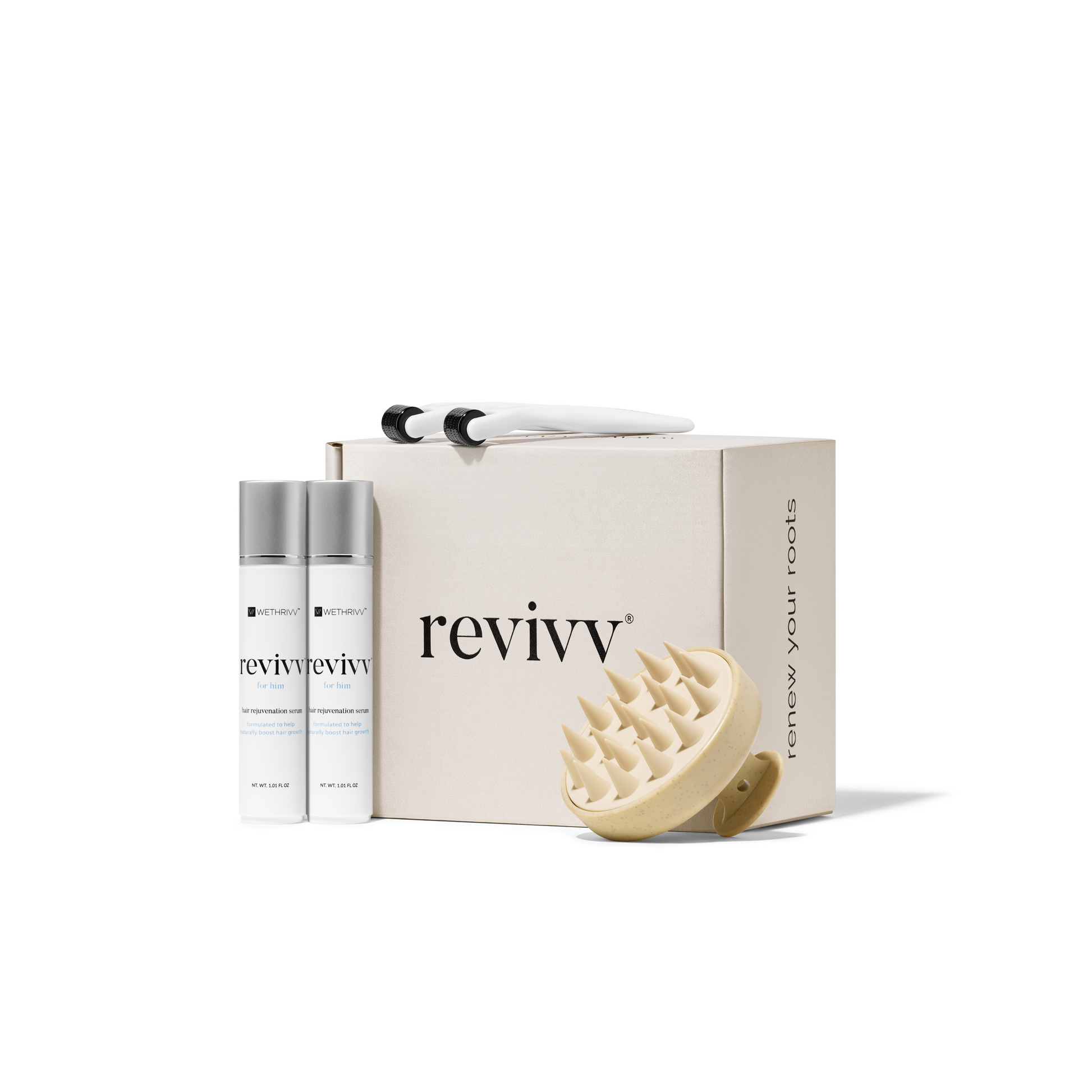 2. Use Revivv serum and scalp massager twice a day and the derma roller twice a week as noted in the Best Results Guide below.